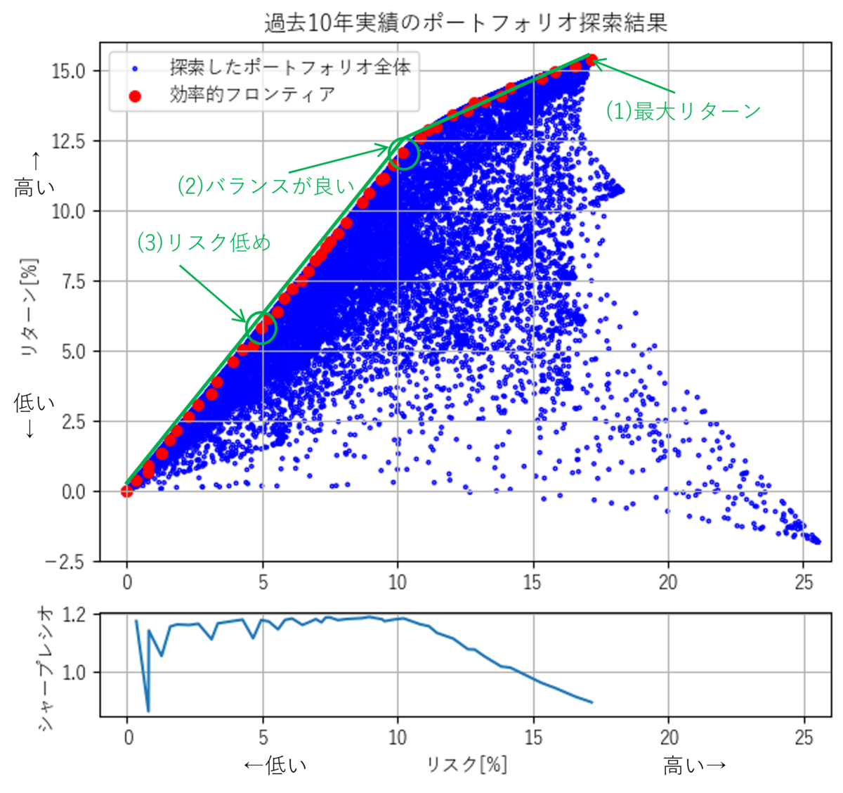 傾きが緩やかであると言う事は、とっているリスクに対して見返りとして期待できるリターンが少ないということになります。実際シャープレシオもリスク10%を超えると低くなっています。そのためリスク10%程度のポートフォリオがシャープレシオが高いポートフォリオの中でも高いリターンの見込めるバランスの良いポートフォリオと言えると思います。